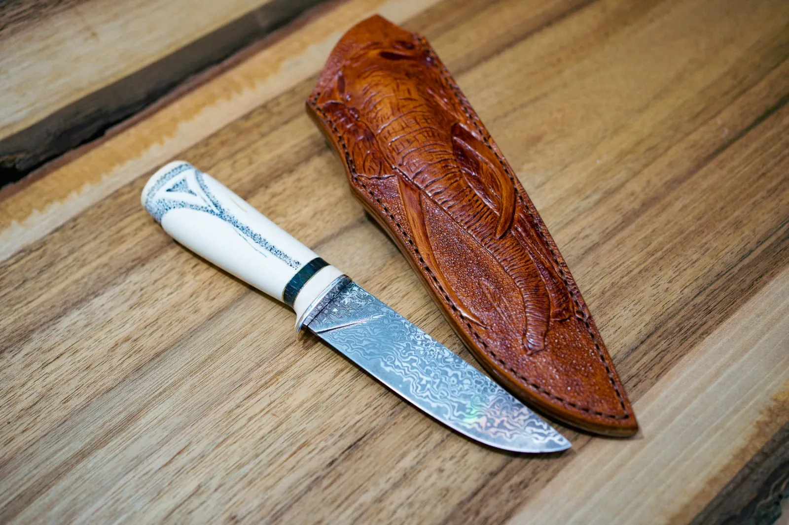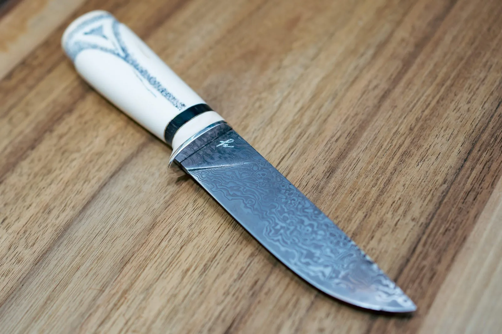 Damascus with VG10 core · Ivory & hand engraved image & silver bolster · 120mm